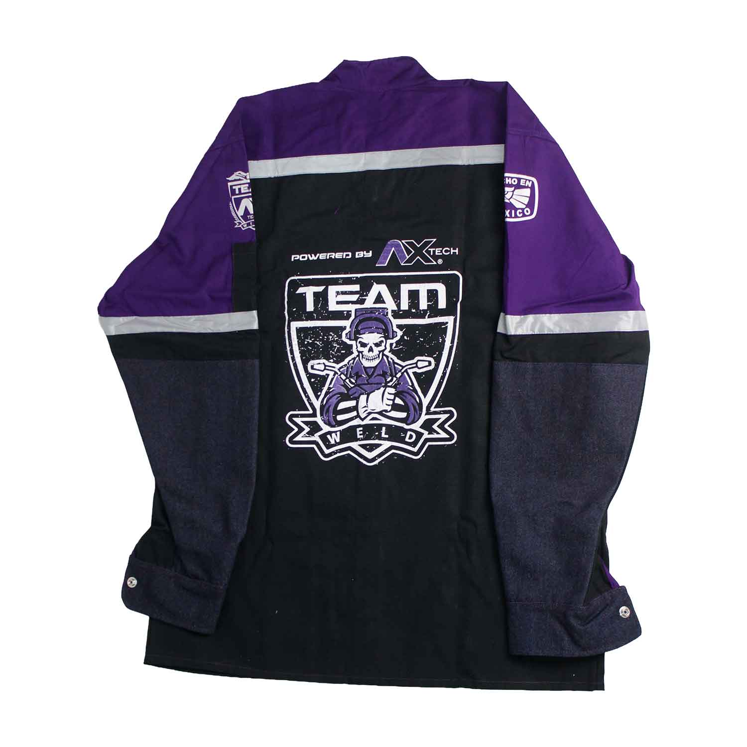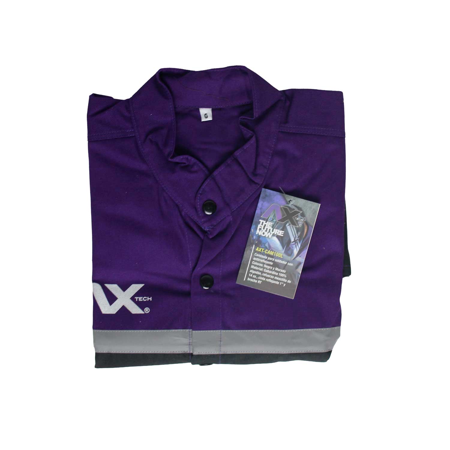 La AXT-CAM100L es una camisola para soldador en gabardina 250 g, 100% algodón, con refuerzo en mangas y puños, mezclilla 14 oz, cinta reflejante de 1”, broche RT y portatizas. Color negro/morado; diseñada para comodidad y protección en taller.