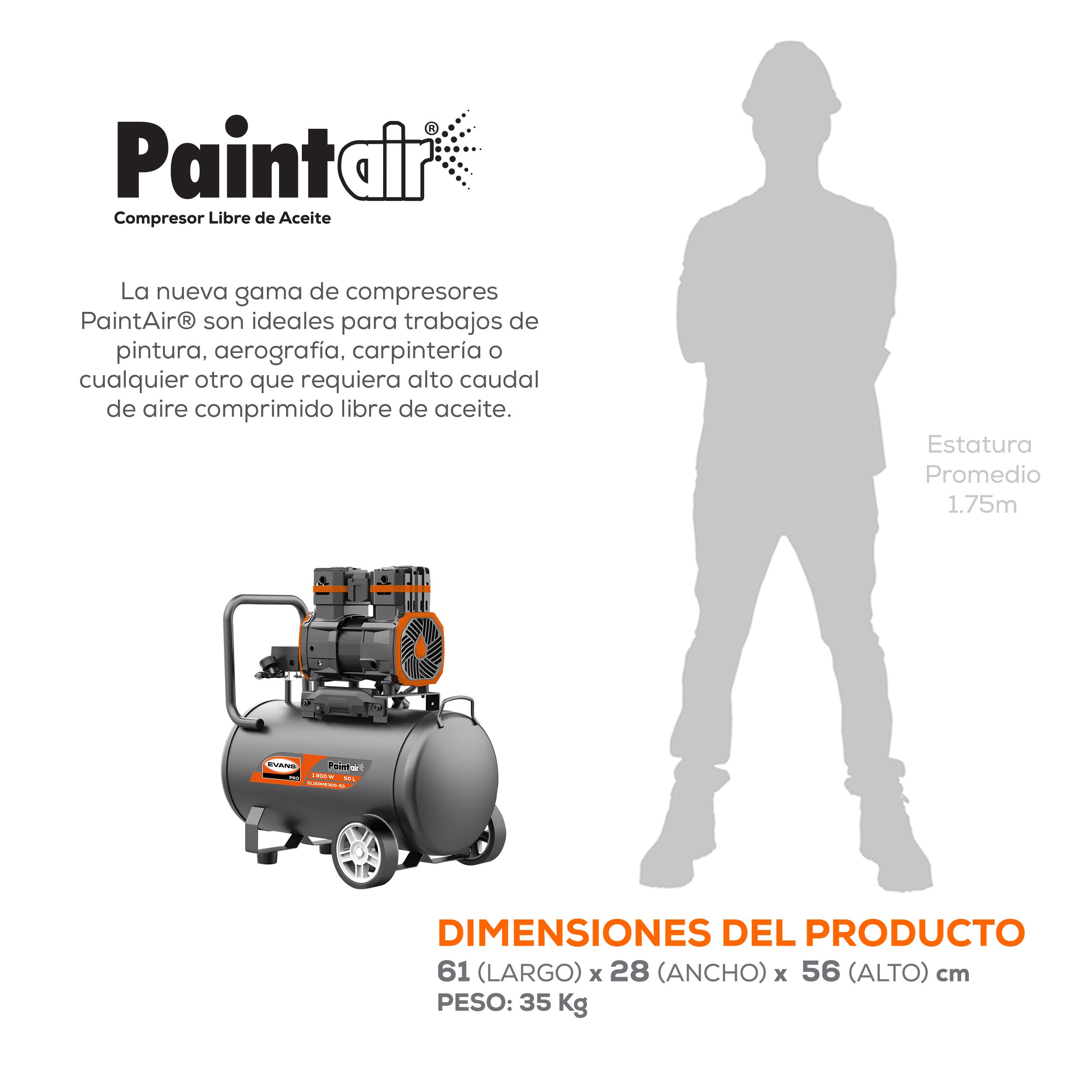 ¿Otra vez lijando porque una gota de grasa te arruinó el barniz? Sé lo frustrante que es perder dinero y tiempo por culpa de un equipo obsoleto. Por eso, yo te traigo la solución definitiva para que tus aplicaciones de aerografía, carpintería y pintura queden impecables al primer toque el Compresor libre de aceite EL150ME300-50. A diferencia de las máquinas tradicionales, este monstruo te entrega aire purísimo porque su sistema de compresión reciprocante de una etapa no utiliza ni una gota de lubricante. Con sus asombrosos 3.00 HP de potencia mecánica y un flujo demoledor de 6.60 CFM a 90 PSI, sentirás la verdadera fuerza de la línea PaintAir de Evans en tus manos.