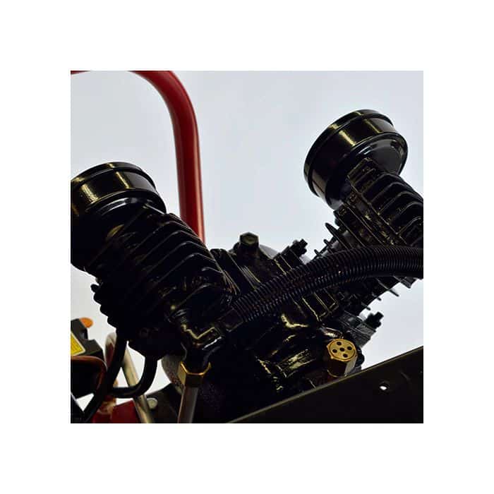 Impulsado por un motor Weg de 2.0 HP a 1750 RPM, asegura un trabajo silencioso y bajo desgaste. Al entregar 6.5 PCM a 90 PSI, tendrás fuerza para operar pistolas de pintura y herramientas de impacto. Además, funciona en redes de 120V o 220V. Su diseño permite reubicarlo fácilmente, funcionando como un excelente compresor de aire portátil E13VME200-130V gracias a sus ruedas antiponchaduras y asa ergonómica.