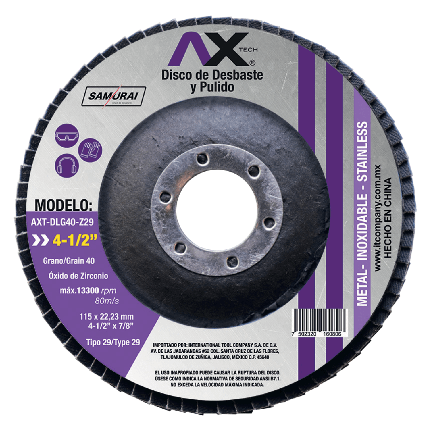 El AXT-DLG40-Z29 es un disco de desbaste y pulido Tipo 29 con óxido de zirconio y grano 40 para metal e inoxidable. Medida 4 1/2″ × 7/8″ (115×22.23 mm), máx. 13,300 rpm (80 m/s). Remoción rápida, menor calor y alta durabilidad para taller y obra. Caja con 50 unidades.