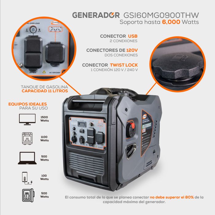 Protege tu familia y hogar ante cualquier apagón con el Generador de luz para casa GSI60MG0900THW de Evans. Un equipo de 6 kVA a 120/240V con tecnología inverter que cuida tus electrodomésticos y herramientas de trabajo. ¡Cómpralo seguro en Solda Express!