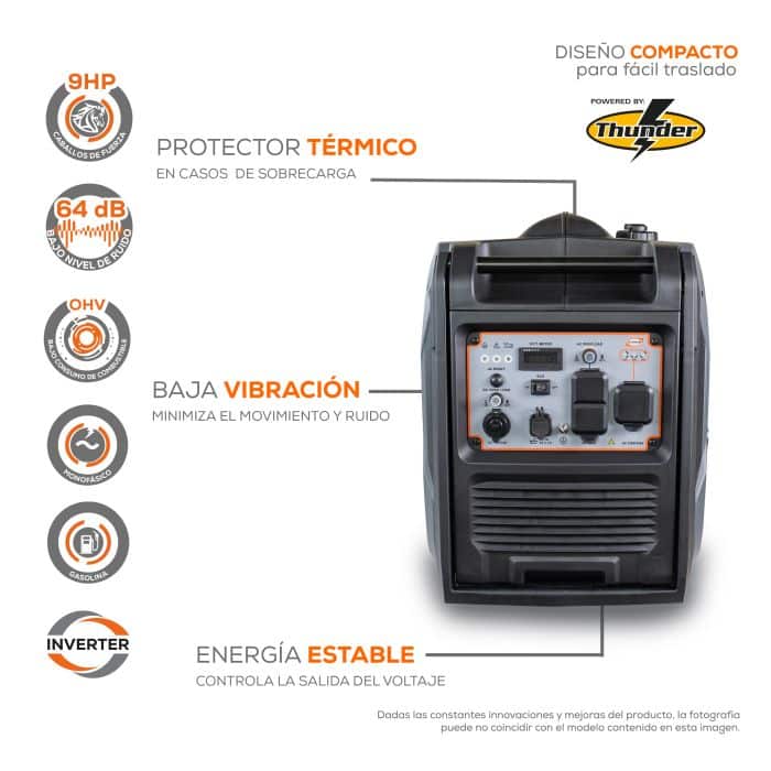 Este equipo no es un motor tradicional; la energía inestable daña las tarjetas de tus aparatos más valiosos. Gracias a que es un generador inverter GSI60MG0900THW, te entrega una onda de corriente pura y perfecta para conectar pantallas, computadoras y equipos electrónicos sin ningún riesgo. Su potente motor Thunder de 9 HP y 223 cc te brinda unos impresionantes 6.00 kVA de potencia máxima y 5.00 kVA nominales.