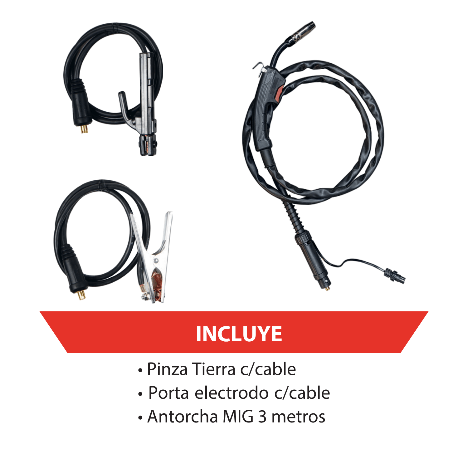 | Incluye | Antorcha MIG 3 m, pinza tierra c/cable, porta electrodo c/cable |