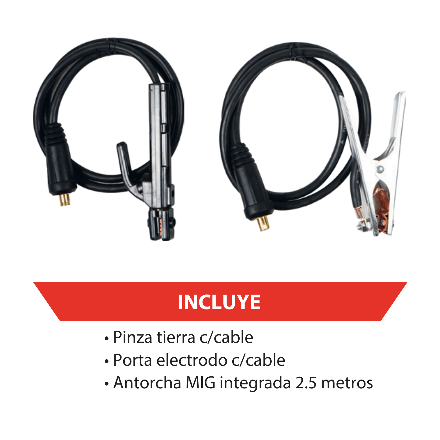 | Incluye | Antorcha MIG integrada 2.5 m, pinza tierra con cable, porta electrodo con cable |